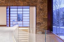 Open living spaces with spectacular mountain views are contrasted with carefully proportioned stone-clad service and circulation bars in this vacation house.